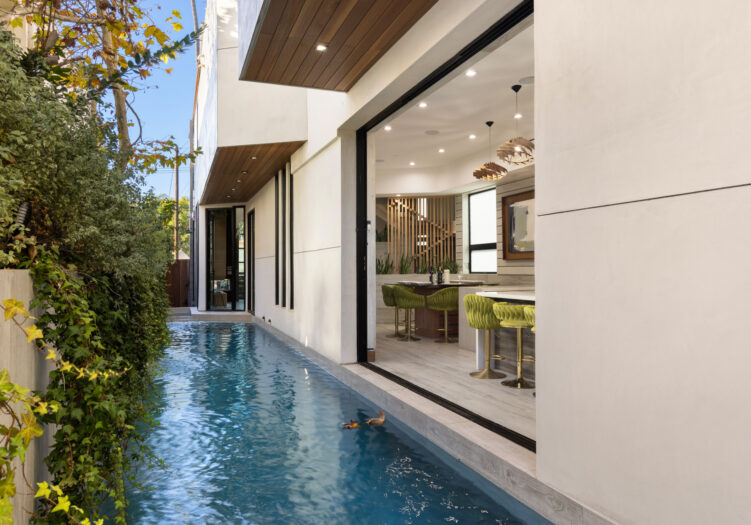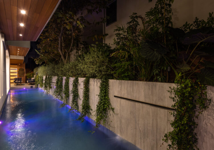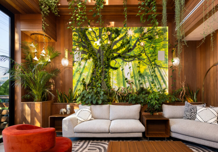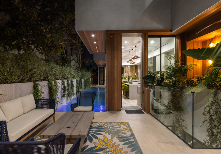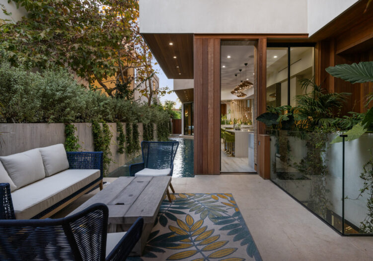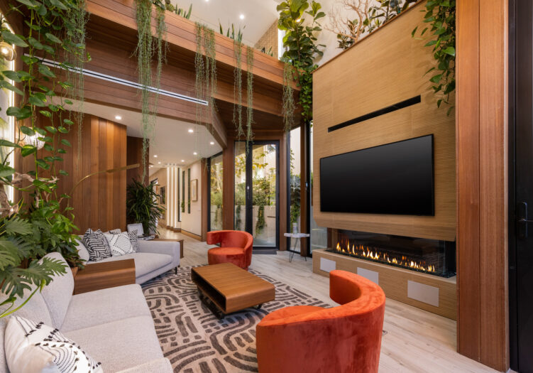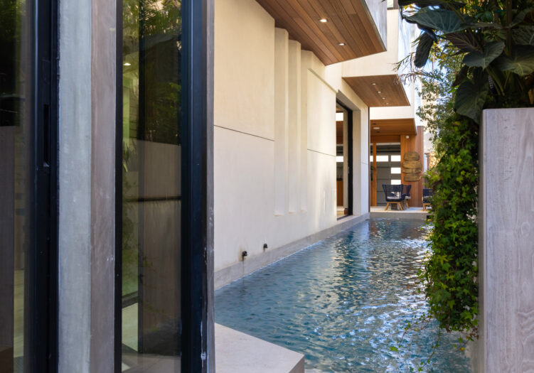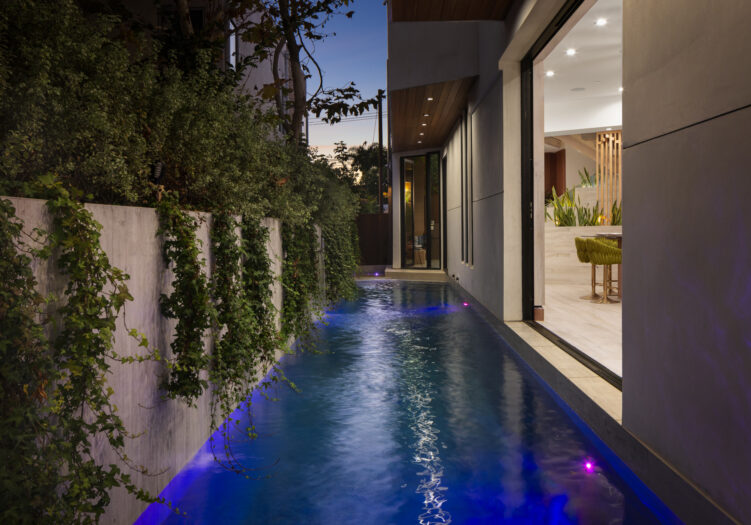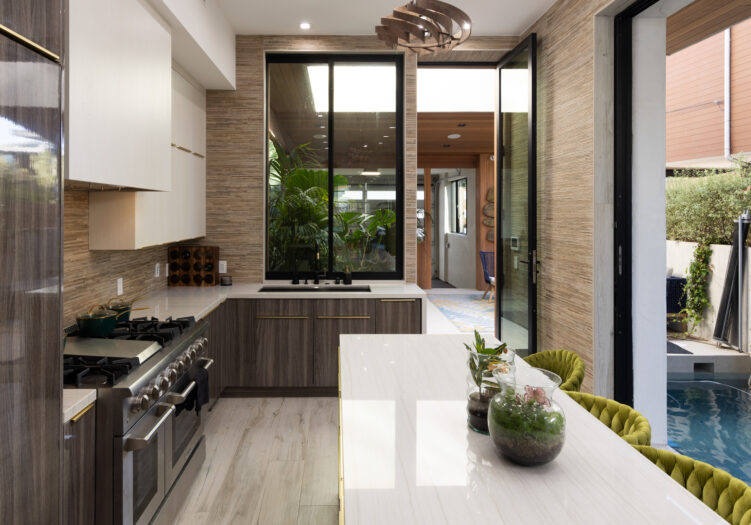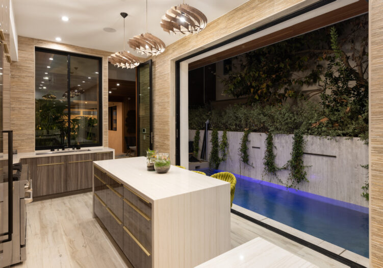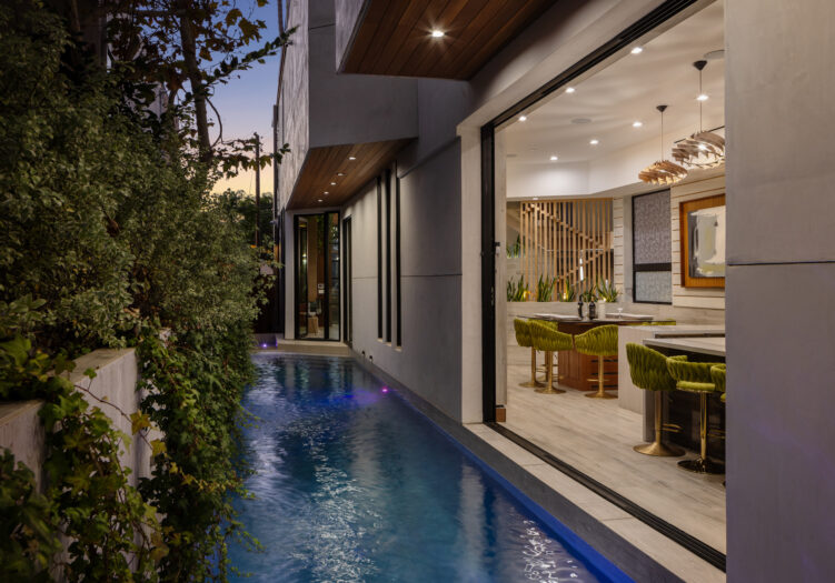 Presenting the iconic "Maya, Lady of Botanica," one of three newly built "Glass Ladies Houses" by acclaimed designer Alon Zakoot. This tropical Tulum-inspired trophy property, has been featured in over fifty publications globally, and is known for its harmonious blend of tropical jungle elements and botanical accents. Step into Maya's realm, where she seamlessly transports you to a world of natural beauty and tranquility. Upon arrival, prepare to be captivated by the grandeur of the towering glass-and-steel entrance, complemented by sloped overhead lines and meticulously curated drought-tolerant flora. The living room features a decadent fireplace, shimmering accent wall, and sliding glass doors that open onto the enchanting patio and walls of glass onlooking the sparkling saltwater pool and spa.The masterfully designed kitchen boasts a double-waterfall island, state-of-the-art appliances, custom cabinetry, and a convenient pass-through to sparkling saltwater pool and spa and the main-level indoor/outdoor lounge, complete with fire pit and additional bar seating. The dining room is adorned with a staircase-turned-art-piece. Ascend to the upper level, where the primary suite awaits, offering a private balcony with stunning views, a floating dual-sink vanity, rainwater shower, separate tub, and a brilliant clerestory window framing vistas of mature palms. The additional bedrooms and bathrooms showcase the finest fixtures and finishes, ensuring a luxurious living experience. Upstairs awaits a stunning rooftop deck with an outdoor kitchen, dining area, lounge furniture and oversized firepit. The rooftop features breathtaking 360-degree views of the cityscape, mountains, downtown Los Angeles and beyond. Descend to the lower level, where a junior primary suite awaits, featuring its own fireplace and an exceptional outdoor living room adorned with a botanical wall and open-air elegance. On this level you will also find a beautiful theater, equipped with a built-in mini bar and blackout shades, as well as an atrium letting in natural elements and light, and an additional guest suite. Maya, Lady of Botanica stands as an extraordinary architectural feat, presenting a rare opportunity to own a slice of tropical Tulum paradise in Silicon Beach. Conveniently located blocks from the best shopping, nightlife and entertainment Venice has to offer on Abbott Kinney and Rose Ave, and moments from the beach, this residence epitomizes a seamless blend of luxury living and Venice lifestyle.
